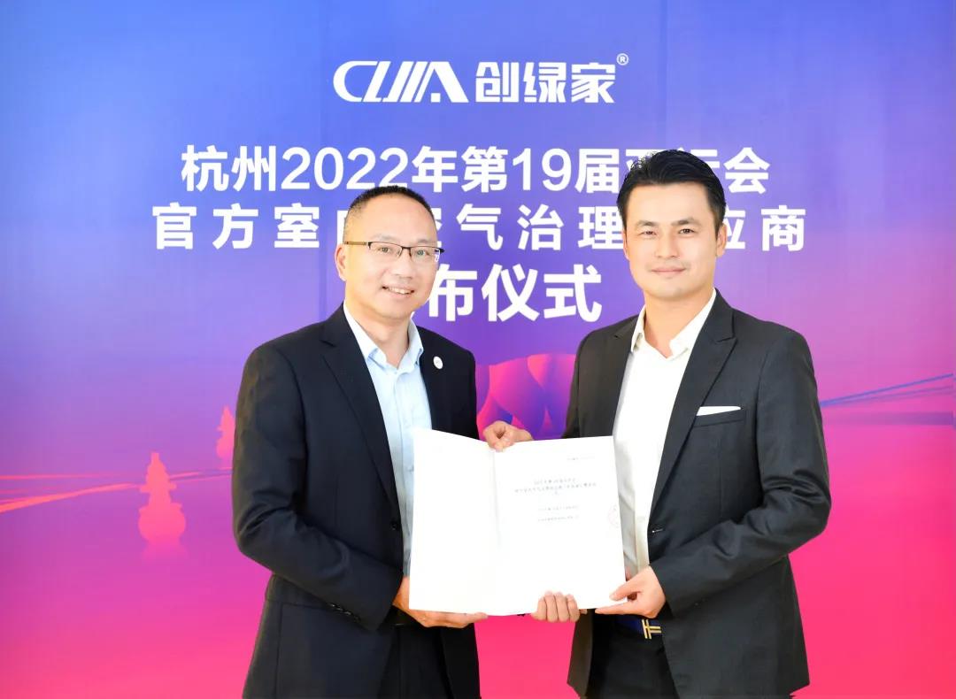 12月23日,杭州創綠家環保科技有限公司(以下稱“創綠家”)與杭州2022年第19屆亞運會組委會(以下簡稱“杭州亞組委”)在杭州市上城區創綠家直播中心舉行創綠家成為杭州2022年第19屆亞運會官方室內空氣治理供應商發布會。